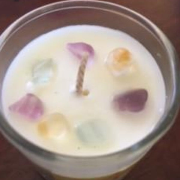 Root Chakra Soy Candle with pure essential oils and charged crystals. The Root chakra is about grounding to the physical world, self-preservation and survival. The body areas associated with the root chakra are your spine, legs, feet, colon, and adrenal glands. This is the chakra to work with when you need grounding in your life.