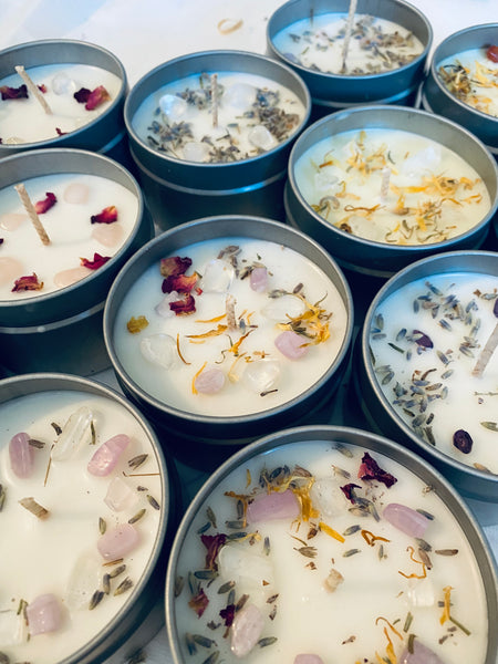 Travel tin soy candles with crystals and aromatherapy blends. These are pure candles we add absolutely no fragrances , only 100% pure essential oils. This makes them very special and suitable for those who prefer a natural aroma. Many aromatherapy candles on the market have fragrance oils added (even though that is not often mentioned in description) You will know by the difference in aroma.